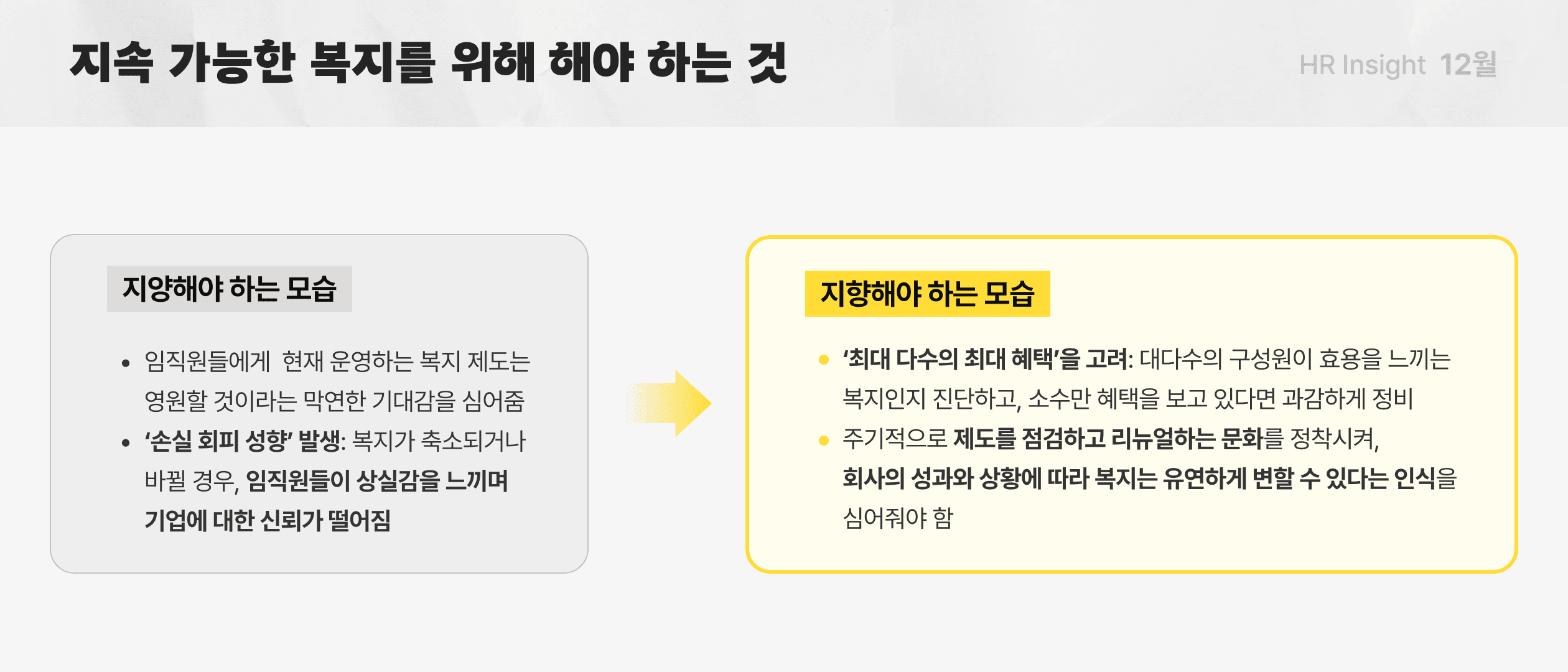 또 하나 중요한 점은, 현재의 복지 제도가 앞으로도 변함없이 유지될 것이라는 기대를 최소화하는 일이다. 이를 위해서는 복지를 고정된 권리가 아니라, 회사 상황과 성과에 따라 주기적으로 점검·조정되는 제도로 인식시키는 문화가 필요하다.