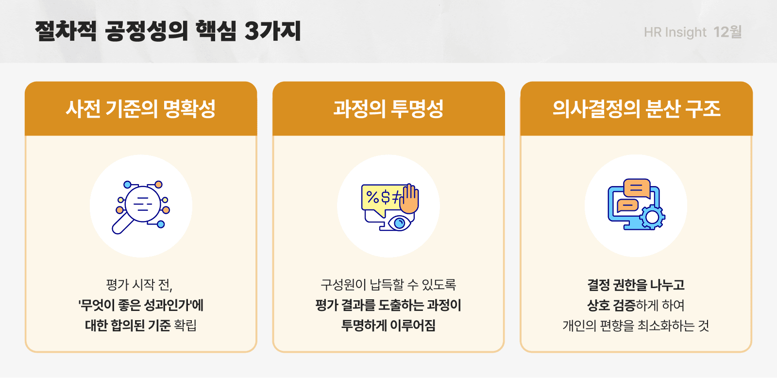 Harvard Business Review는 이를 ‘Fair Process(공정한 과정)’로 설명한다. 사람들은 결정 자체만큼이나 그 결정이 만들어지는 방식 - 설명 가능성, 참여감, 일관된 기준 - 에 민감하게 반응한다. 결국 평가는 점수 게임이 아니라 신뢰의 게임이다.