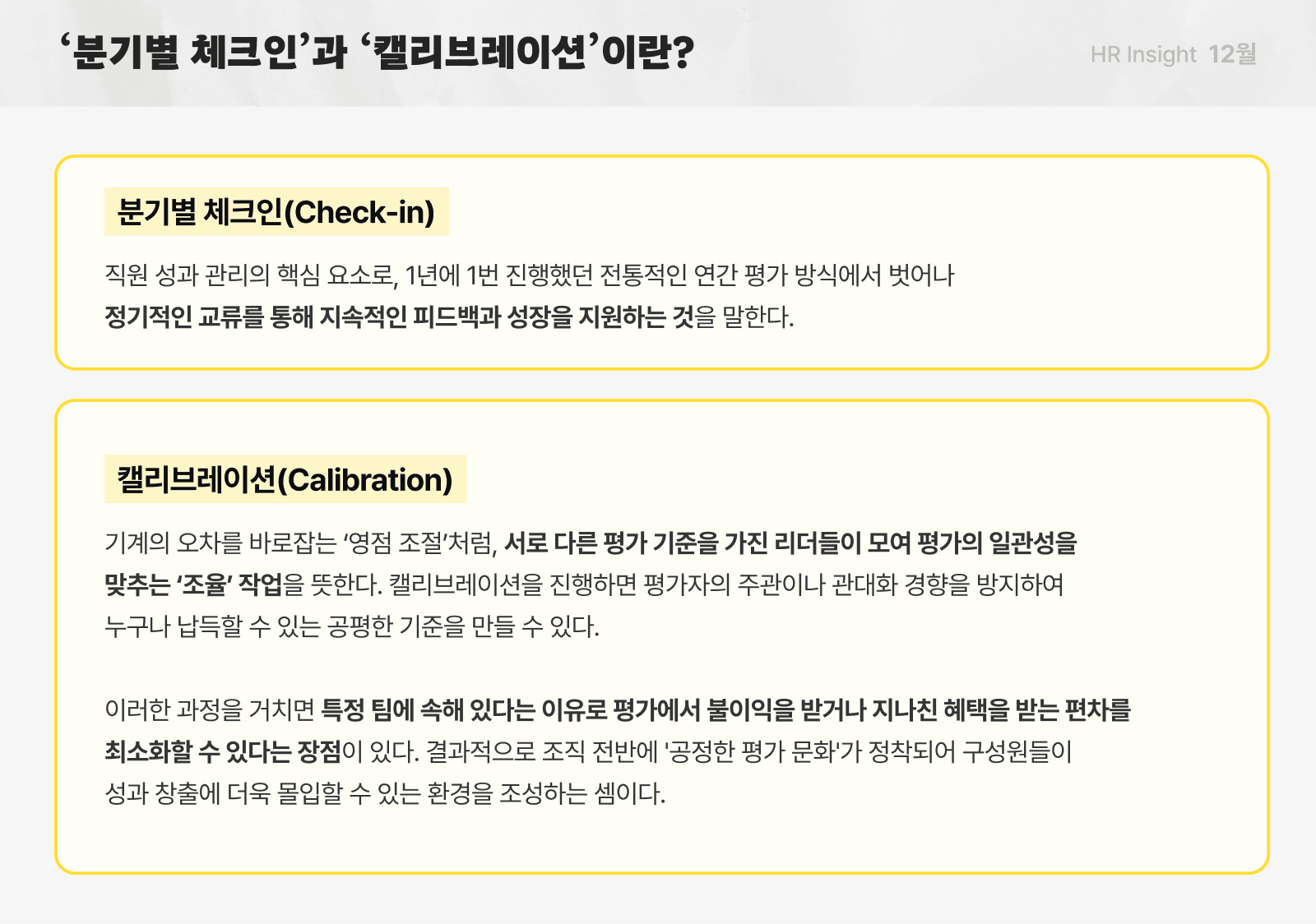 분기별 체크인(Check-in): 직원 성과 관리의 핵심 요소로, 1년에 1번 진행했던 전통적인 연간 평가 방식에서 벗어나 정기적인 교류를 통해 지속적인 피드백과 성장을 지원하는 것을 말한다.