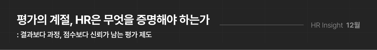 12월, HR은 평가 결과를 설명하는 사람이 아니라 평가가 남기는 경험을 설계하는 역할을 맡고 있다. 완벽한 평가는 존재하지 않는다. 그러나 투명한 기준, 예측 가능한 과정, 집단적 의사결정 구조, 그리고 성장을 향한 일관된 메시지가 있다면 평가는 갈등의 원인이 아니라 신뢰의 기반이 된다.