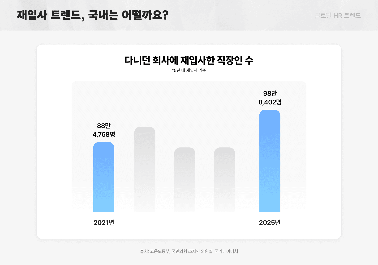 고용노동부가 제출한 자료에 따르면, 퇴사 후 5년 이내 원래 직장으로 재입사한 인원은 2021년에 약 88만 명에서 2025년에 98만 명으로 4년 동안 12%가 증가했다고 해요. 특히 올해는 그 수가 100만 명을 넘어설 것으로 전망하고 있어요.