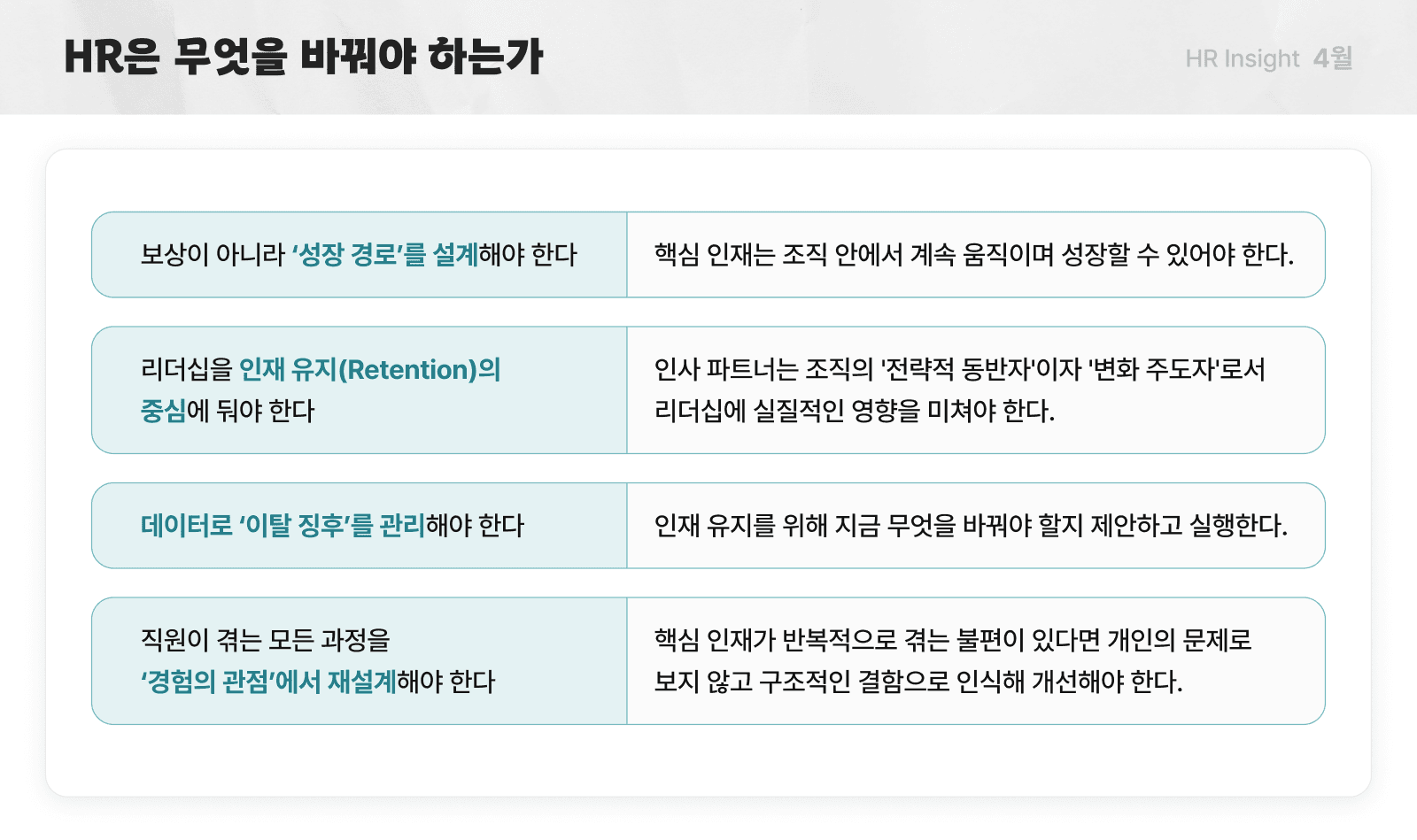 HR이 해야 할 일은 사람을 억지로 붙잡는 것이 아니라, 조직 안에서 계속 성장하게 만드는 구조를 설계하는 것이다.
