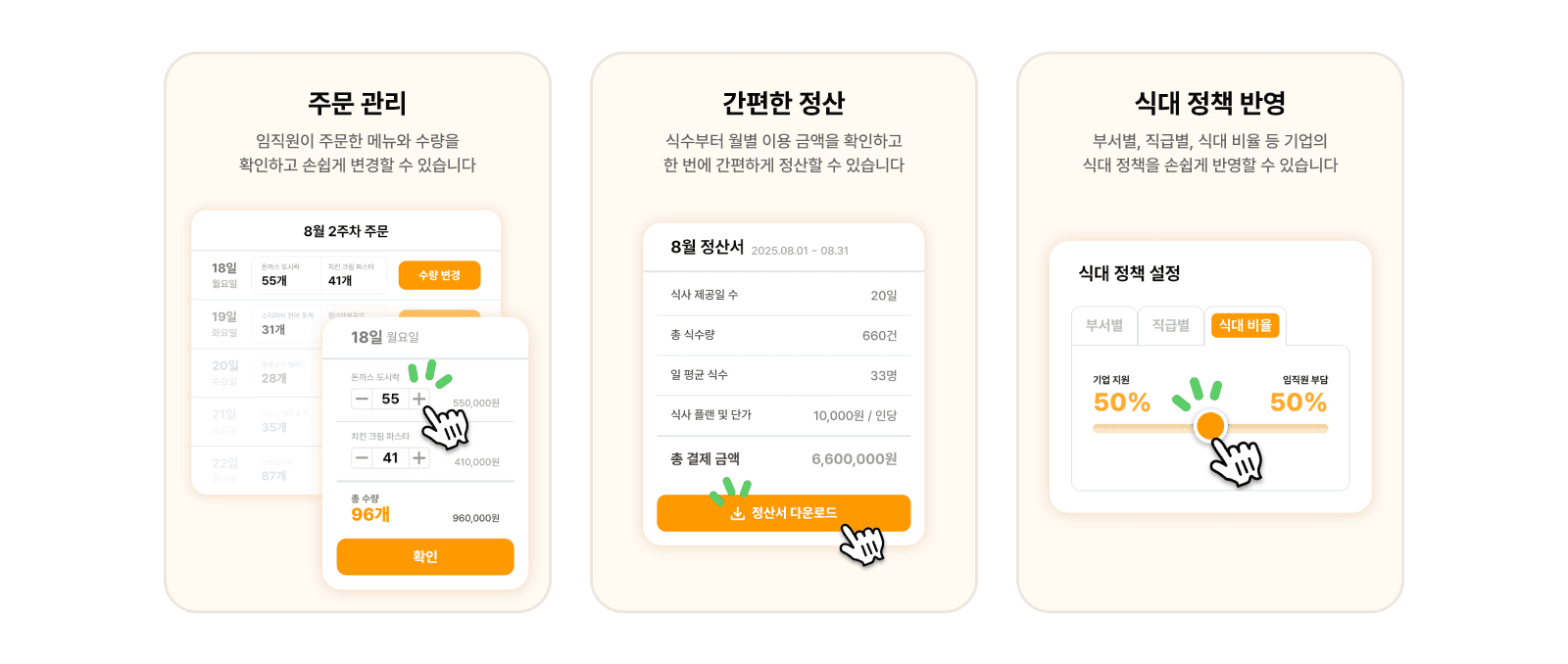 주문 관리부터 정산까지 앱 하나로 해결되니, 담당자님의 복잡한 행정 업무가 싹 사라질 거예요.