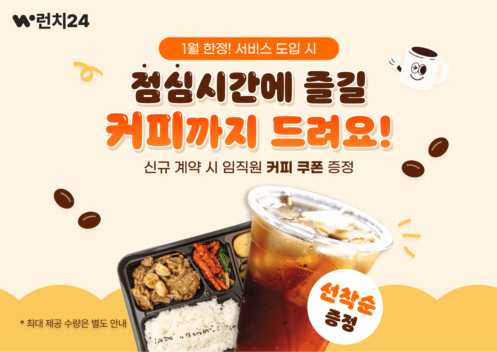 런치24 도입을 결정해 주신 기업을 위해 특별한 선물을 더 준비했어요. 맛있는 점심 식사 후, 동료들과 티타임을 즐기실 수 있도록 임직원분들께 커피 쿠폰도 드려요! 든든한 점심 먹고 향긋한 커피로 오후 업무 활력까지 선물해 주세요.