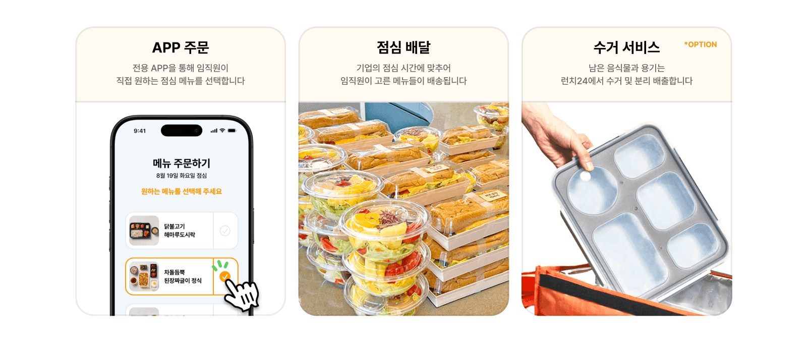 런치24는 강남 기업을 대상으로 도시락 배송부터 수거, 정산까지 한 번에 해결해주는 기업 전용 점심 구독 서비스입니다. 길 위에서 버려지는 아까운 시간을 여유로운 휴식으로 바꿔드리고, 매일 새로운 맛집 메뉴를 사무실 책상 앞까지 배달해 드리고 있어요.