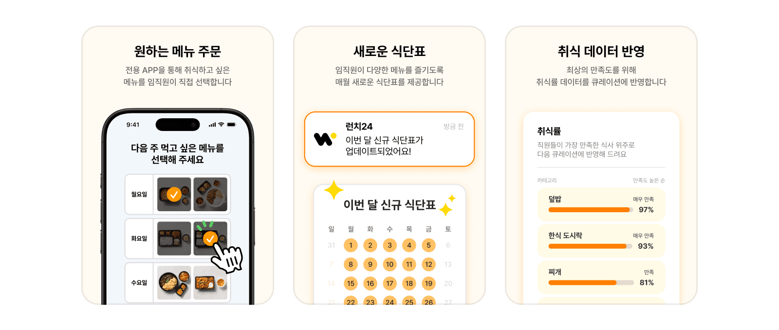 매일 바뀌는 식단 덕분에 내일은 뭘 먹을지 기대하는 즐거운 점심시간을 만들어 드릴게요.