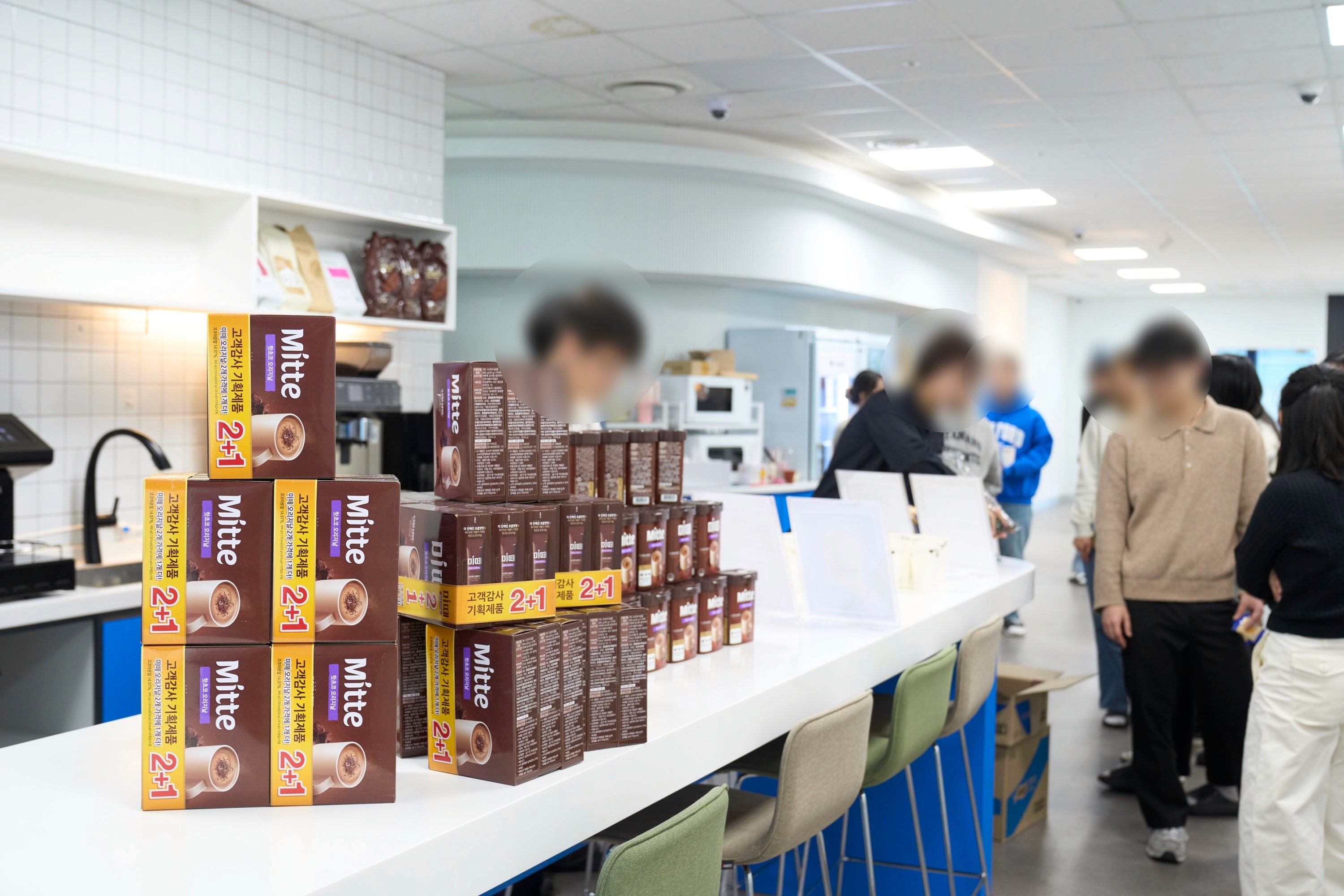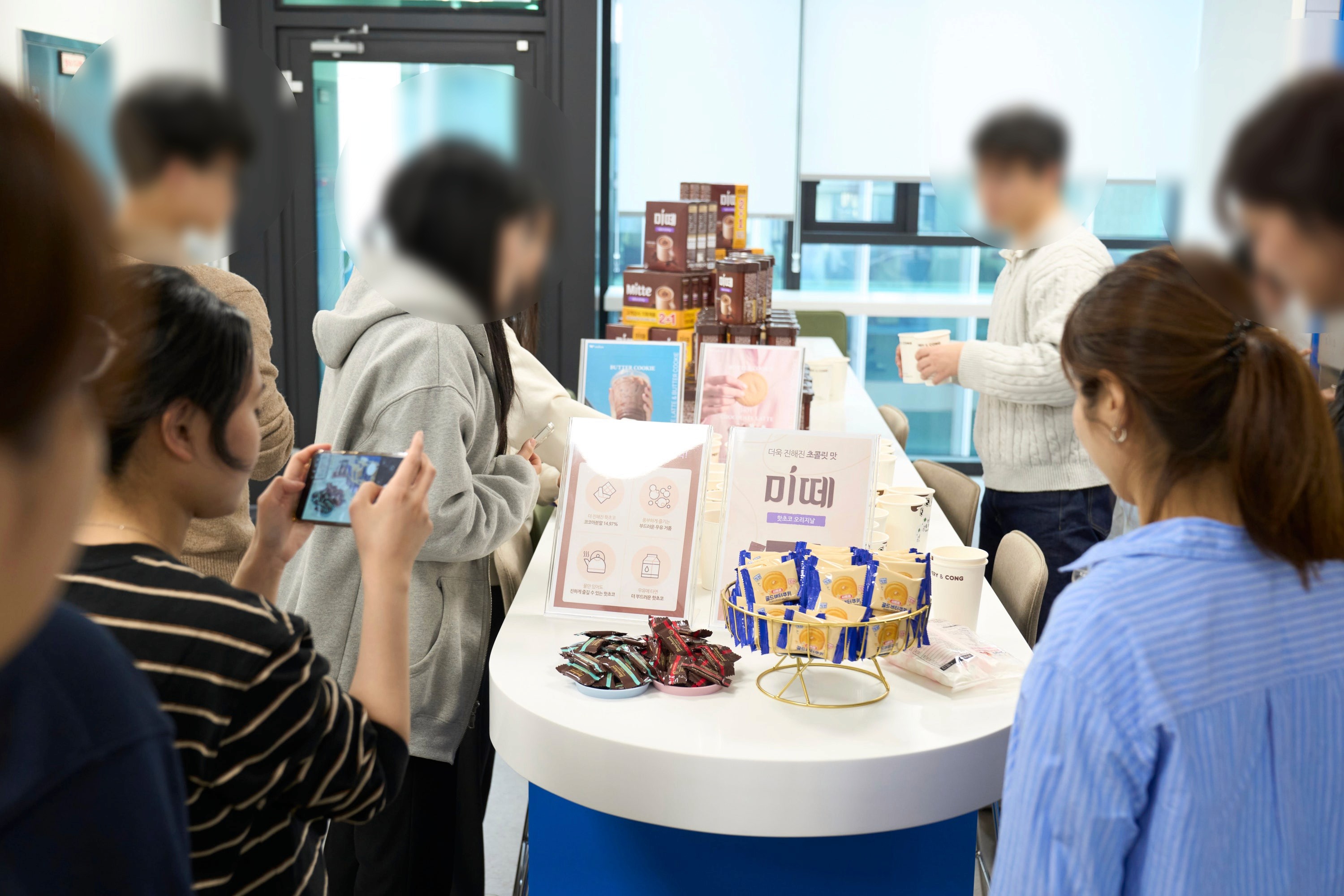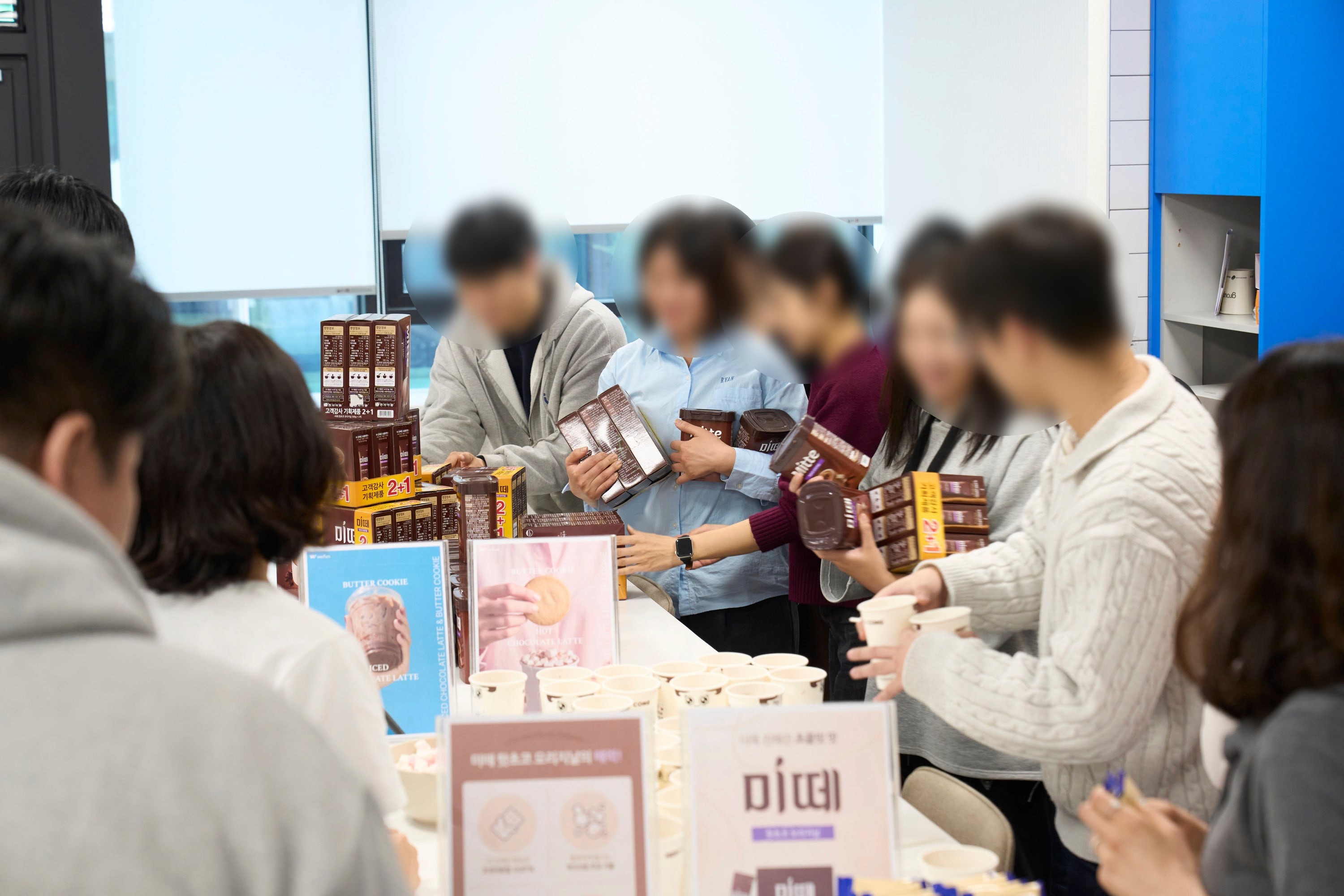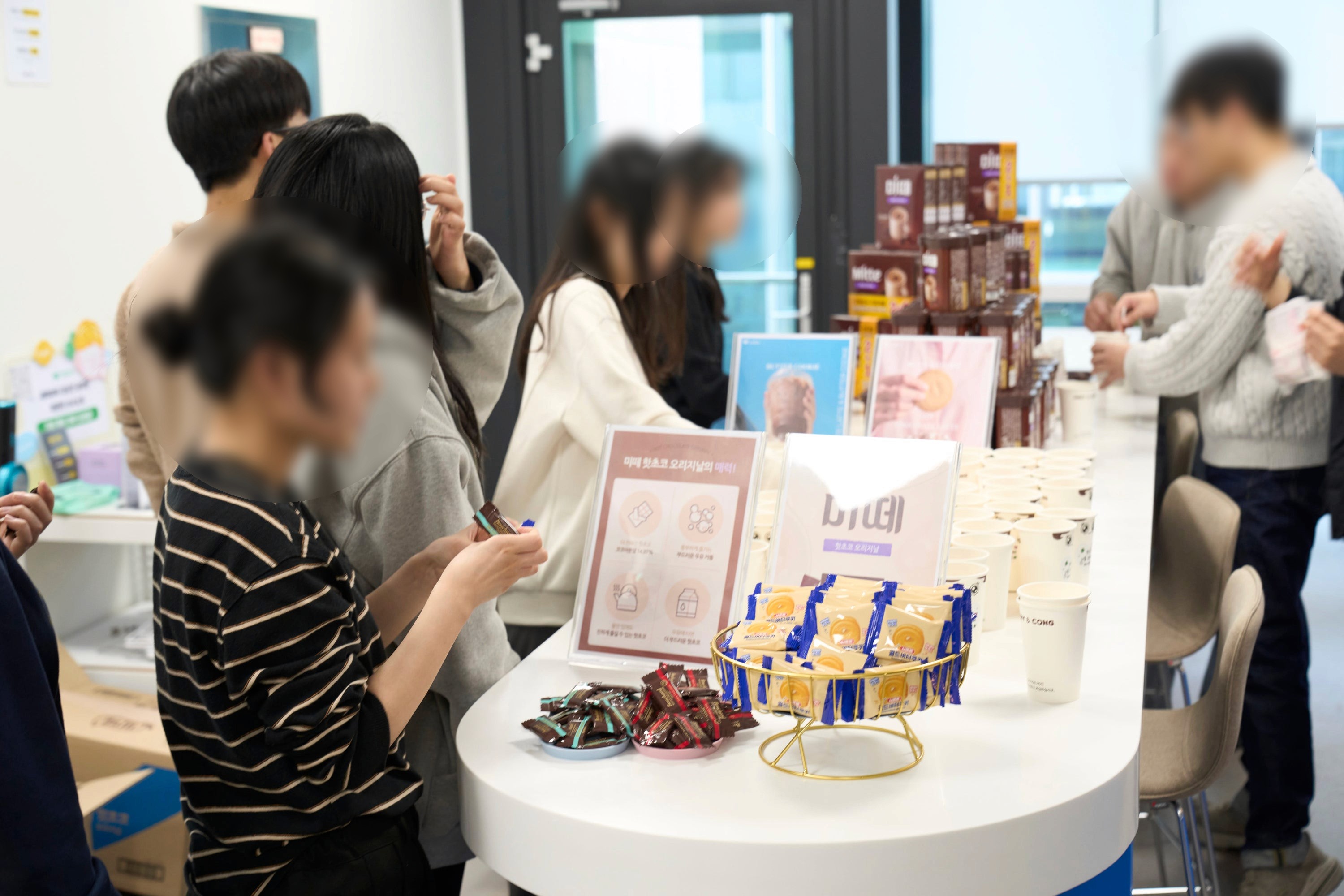 라운지 이용 안내가 공지되자마자 현장의 열기는 그야말로 역대급이었는데요! 초코라떼를 수령하기 위해 라운지 밖까지 긴 대기 줄이 늘어서며 미떼를 향한 임직원들의 뜨거운 관심을 확인할 수 있었어요.