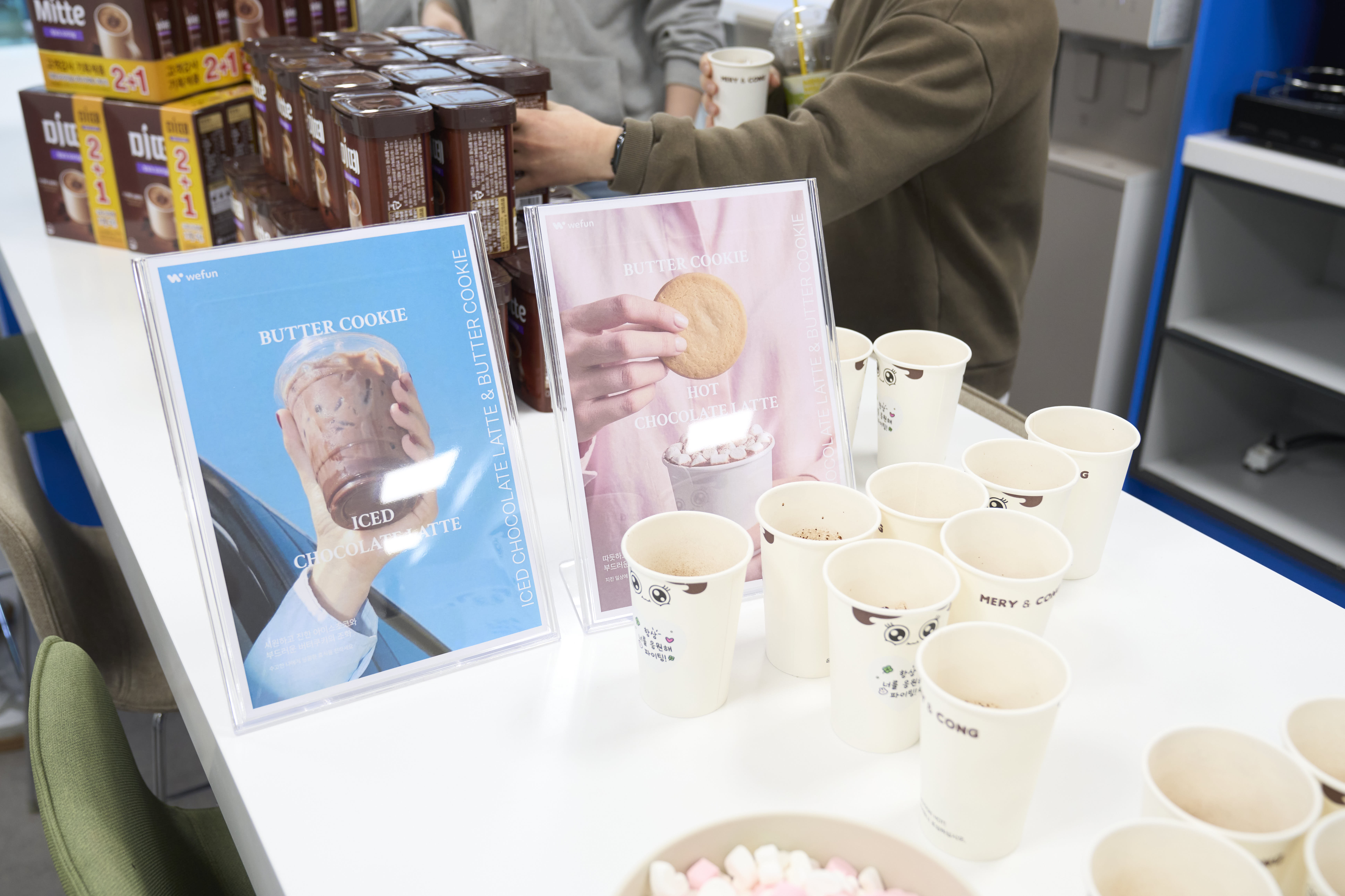 현장에서 즐기는 음료 외에도, 사무실 자리로 돌아가 언제든 꺼내 먹을 수 있도록 미떼 스틱과 캔 제품을 별도로 배치했어요. 현장의 경험이 단발성으로 끝나지 않고, 업무 공간에서도 브랜드 체험이 지속될 수 있도록 접점을 대폭 넓히고자 노력했죠!