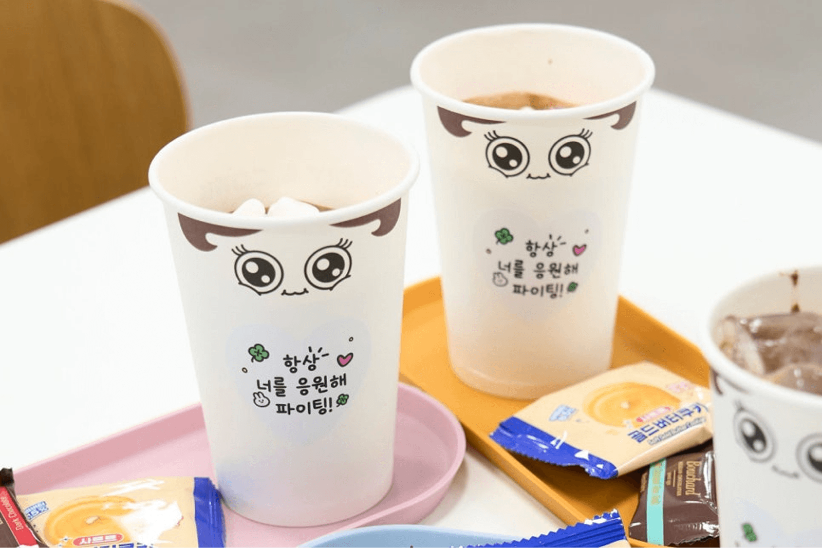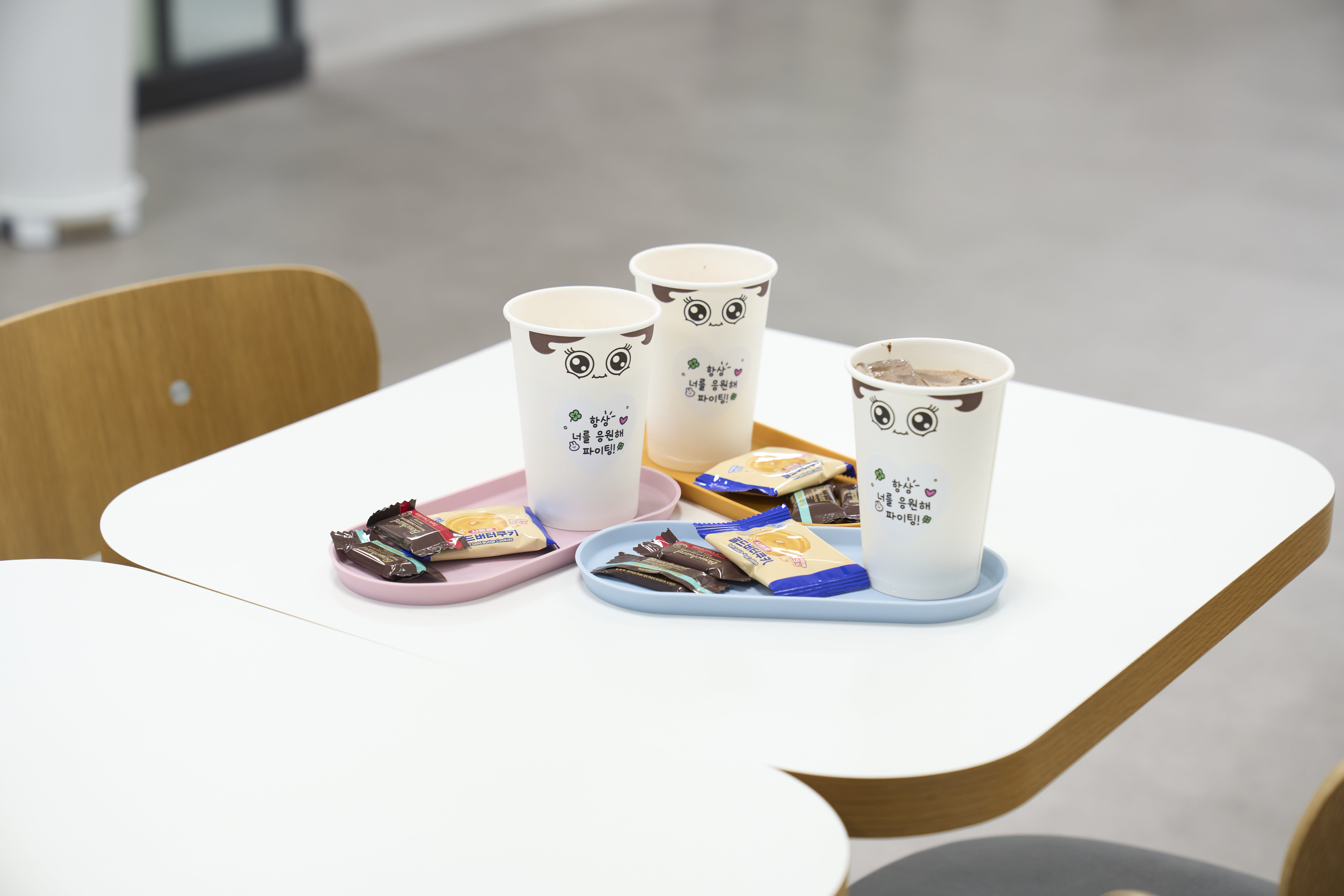 컵 홀더에는 "오늘도 힘내세요!"와 같은 따뜻한 응원 문구가 담긴 커스텀 스티커를 부착하여 보는 맛을 더했어요. 반복되는 업무에 지친 직장인들의 사기를 북돋우는, 위펀애드만의 다정하고 섬세한 디테일이었죠! ✨