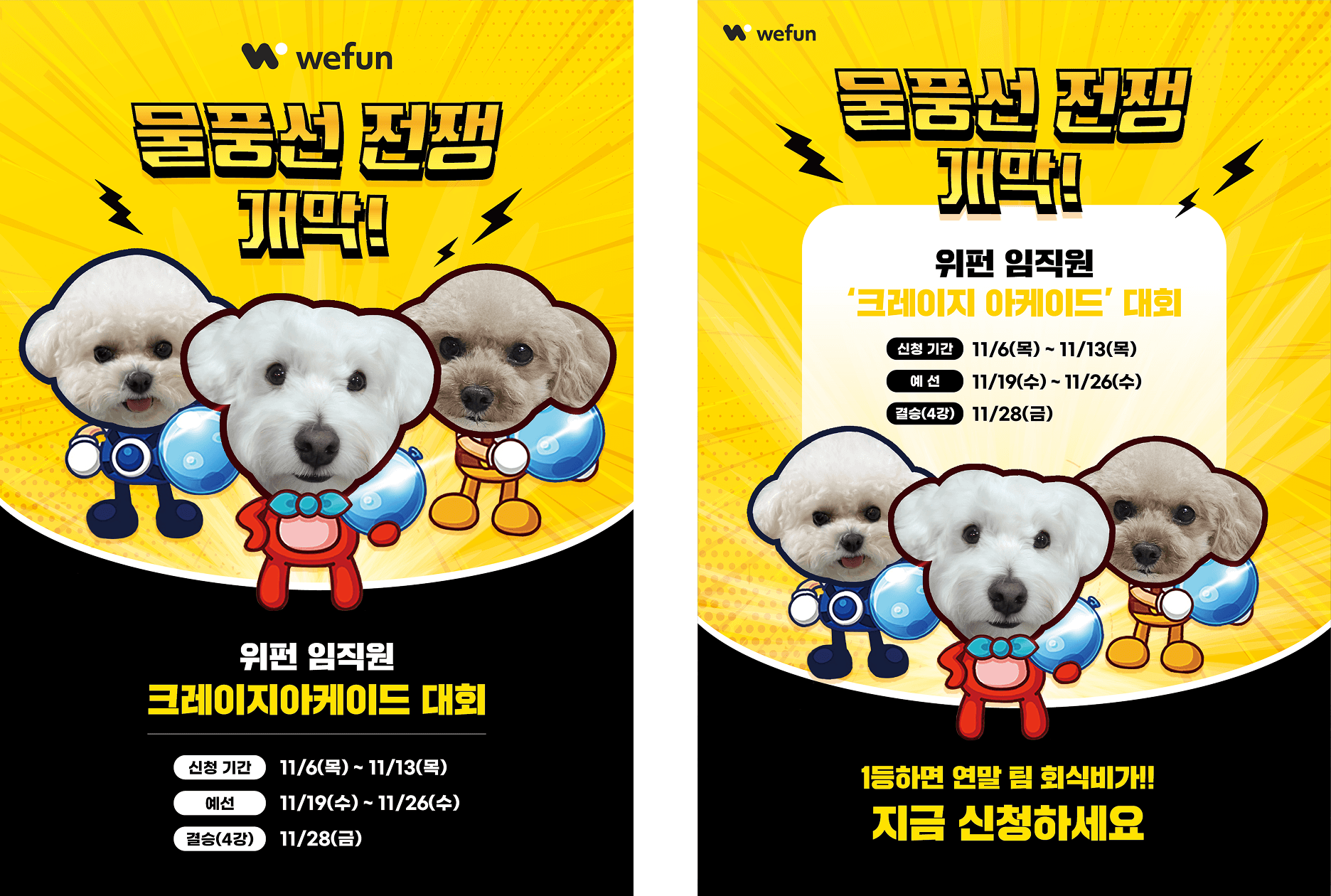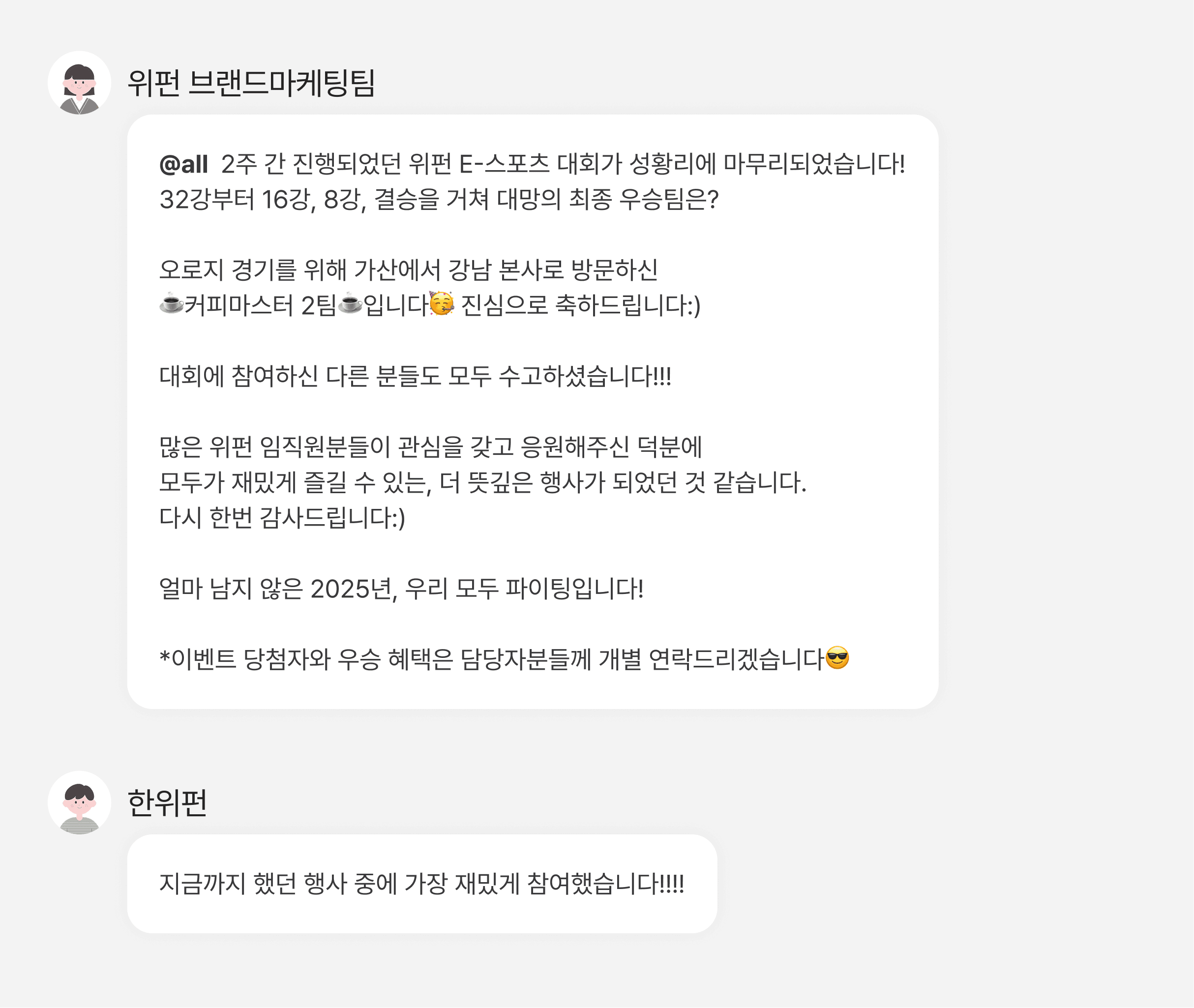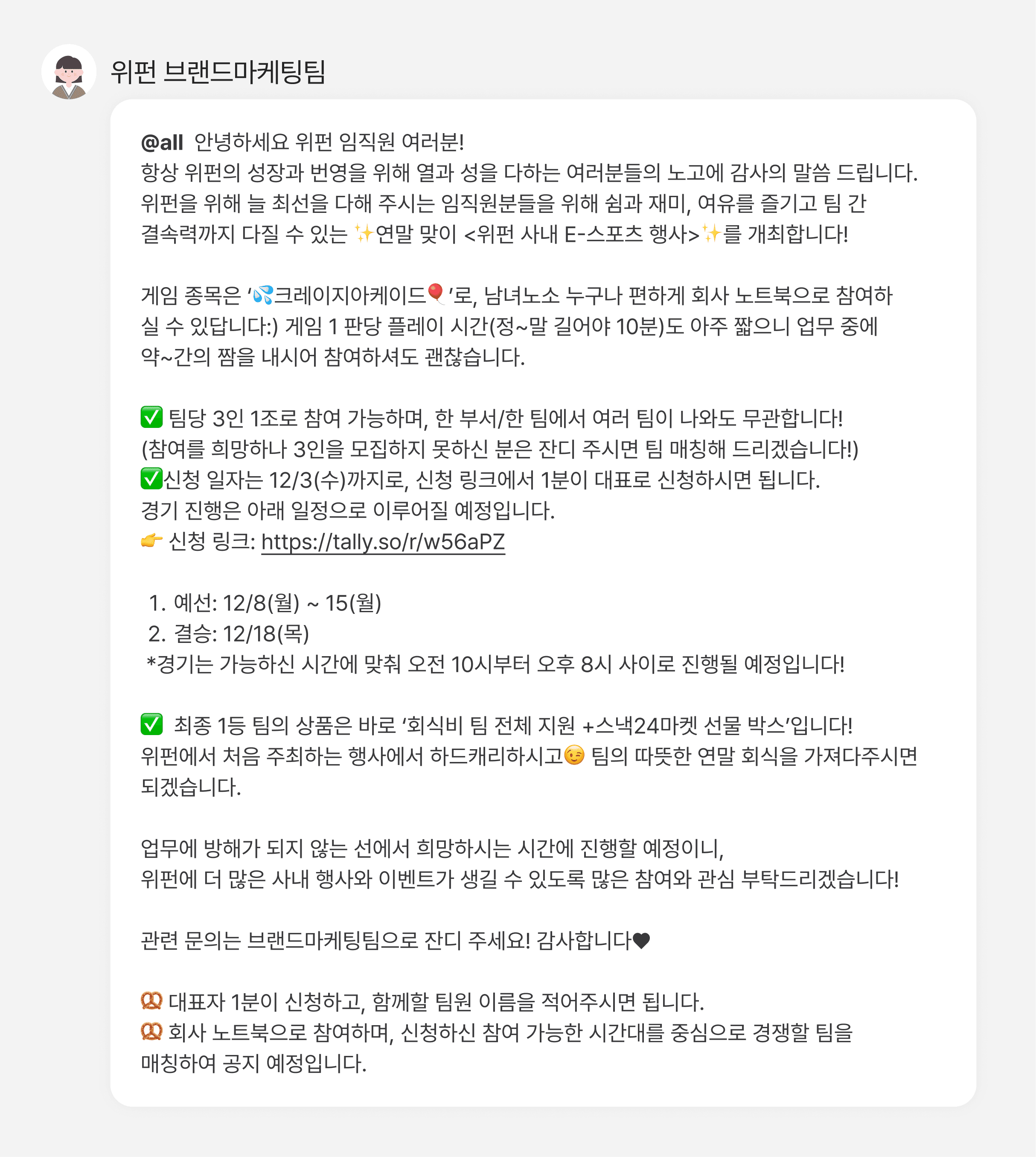 활기의 시작은 11월 말, 사내 메신저에 올라온 한 통의 공지였어요. 연말을 맞아 위펀 구성원들이 하나 되어 즐길 수 있는 위펀 E-스포츠 행사를 개최한다는 소식이었는데요. 바쁜 연말, 업무로 지친 임직원들에게 활력을 불어넣고 서로 다른 부서가 자연스럽게 어우러질 수 있는 자리를 마련하기 위함이었죠💌