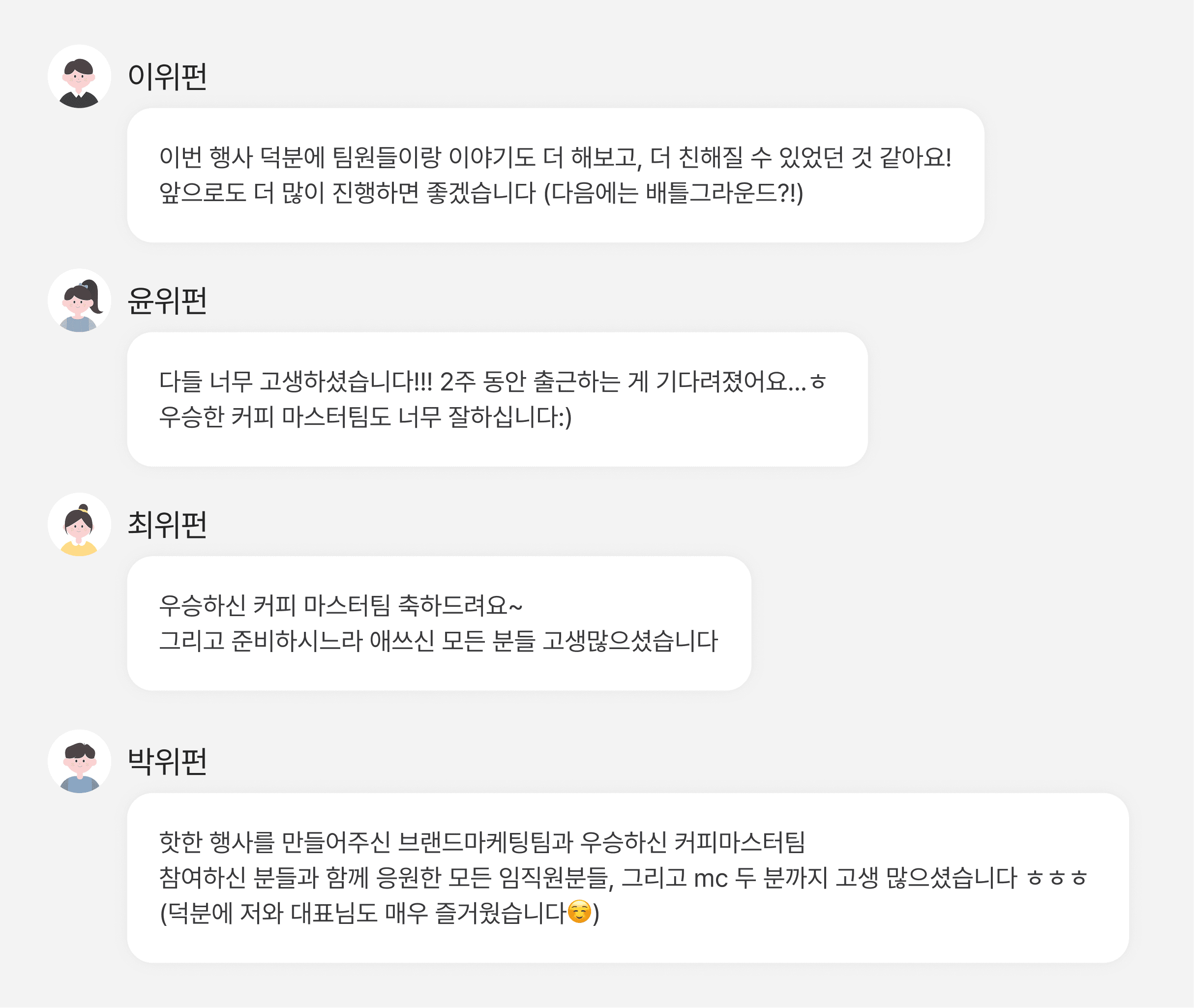 저희는 이번 대회를 직접 기획하고 운영하면서 조직에 미치는 긍정적인 효과를 눈으로 확인할 수 있었어요. 잘 짜인 소통의 기회가 임직원들의 사기에 얼마나 긍정적인 영향을 미치는지, 그리고 그것이 기업 문화에 어떤 강력한 에너지를 불어넣는지를 말이죠🔥