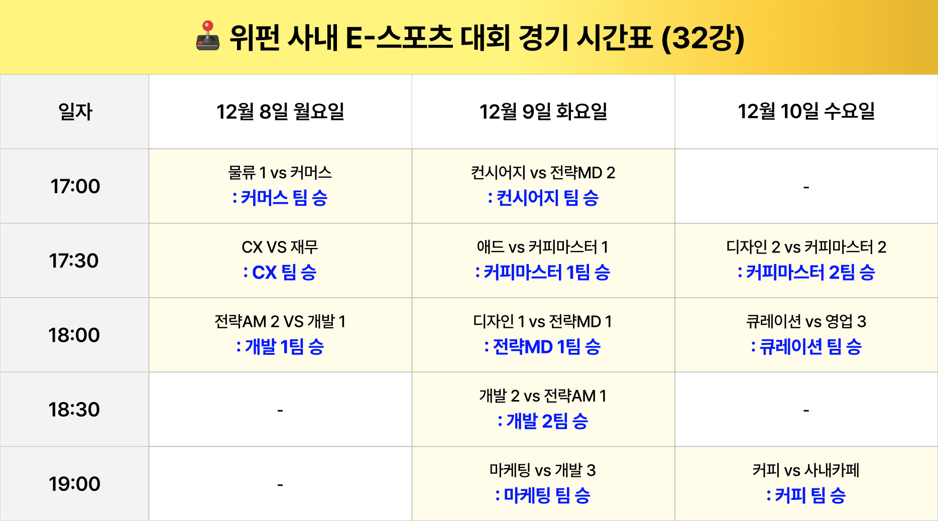 12월 초, 32강 토너먼트로 본격적인 행사가 시작되었어요. 약 열흘간 진행된 예선전은 참여자들의 본업에 지장이 없도록 집중 업무 시간(Core Time)을 피해 구성되었는데요. 덕분에 업무에 지칠 때쯤, 경기에 참여함으로써 무료했던 회사 생활에 특별함과 즐거움을 더할 수 있었죠😊