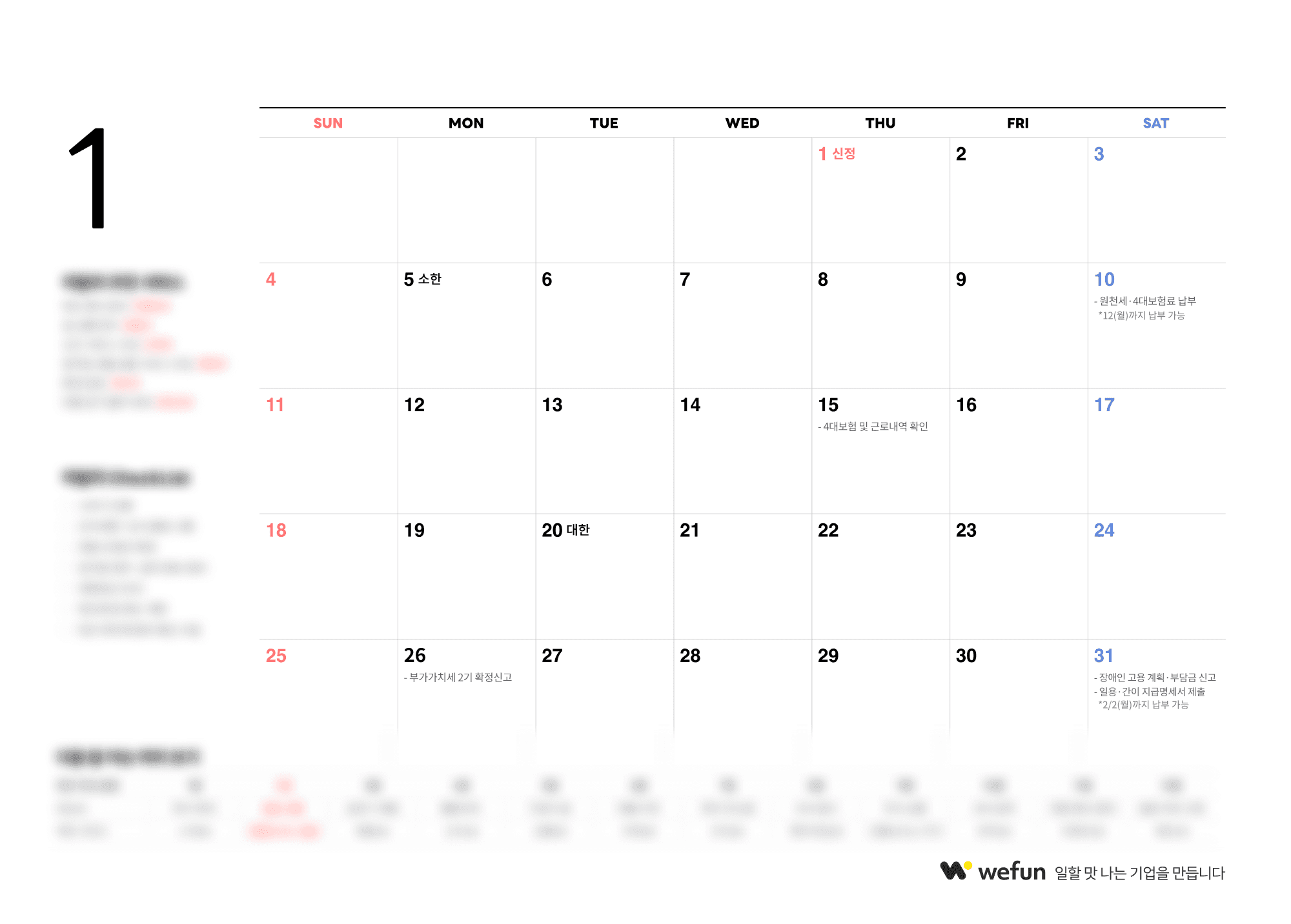 매월 반복되는 4대 보험료 납부일부터 부가가치세 신고, 연말정산 등 자칫 놓치면 큰일 나는 주요 일정까지! 복잡한 HR 이슈를 한눈에 파악할 수 있도록 꼼꼼하게 정리했어요. HR 이슈뿐만 아니라, 시기별 임직원 만족도를 높여줄 이벤트 큐레이션과 달력 한정 위펀 시크릿 혜택까지 담았답니다😄