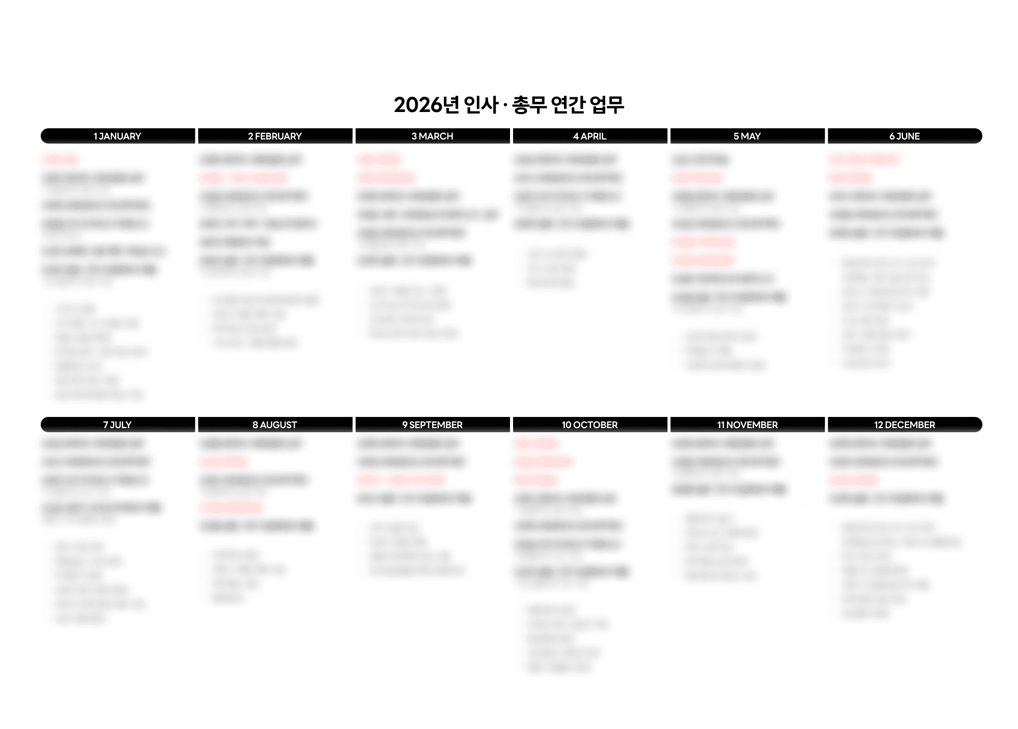 달마다 챙겨야 하는 루틴 업무는 물론, 놓치면 과태료 폭탄을 맞을 수 있는 중요한 HR 데드라인을 ‘2026년 인사·총무 연간 업무’로 보기 쉽게 정리했어요.