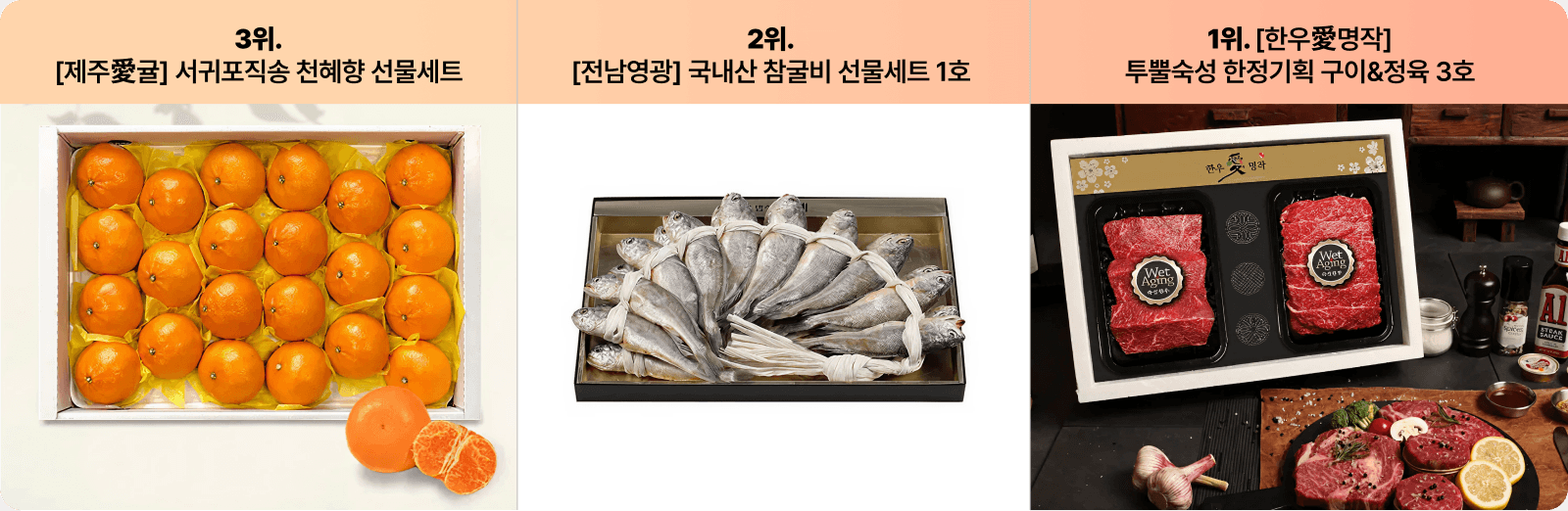 3위. [제주愛귤] 서귀포직송 천혜향 선물세트, 2위. [전남영광] 국내산 참굴비 선물세트 1호, 1위. [한우愛명작] 투뿔숙성 한정기획 구이&정육 3호
