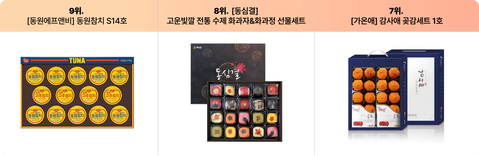 9위. [동원에프앤비] 동원참치 S14호, 8위. [동심결] 고운빛깔 전통 수제 화과자&화과정 선물세트, 7위. [가온애] 감사애 곶감세트 1호