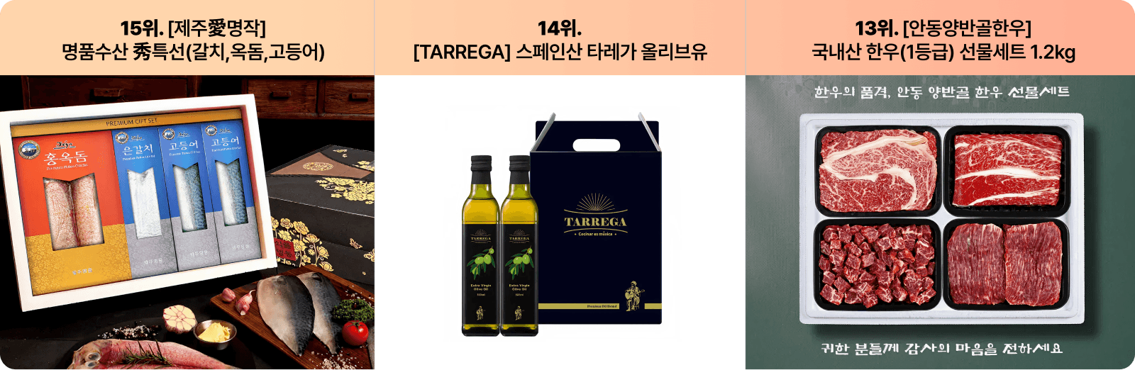 15위. [제주愛명작] 명품수산 秀특선(갈치,옥돔,고등어), 14위. [TARREGA] 스페인산 타레가 올리브, 13위. [안동양반골한우] 국내산 한우(1등급) 선물세트 1.2kg