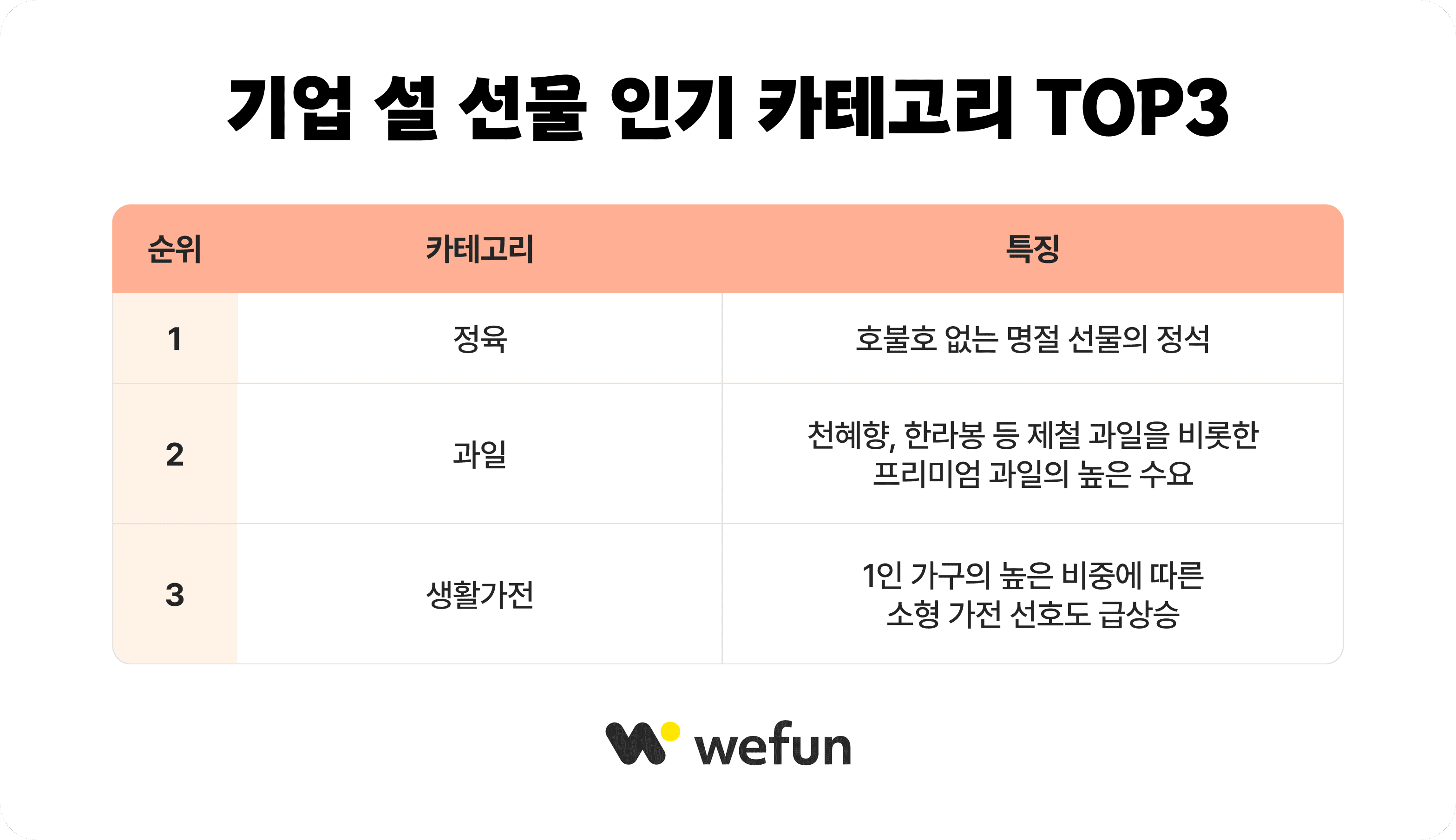 명절 선물의 양대 산맥인 '정육'과 '과일'에 이어, ‘생활가전’이 전체 3위를 차지했다는 점이 눈여겨볼 만한 부분인데요. 먹고 없어지는 1회성 상품이 아니라, 일상생활에 유용한 실용적인 선물을 선호하는 기업 선물 트렌드의 변화를 엿볼 수 있어요.