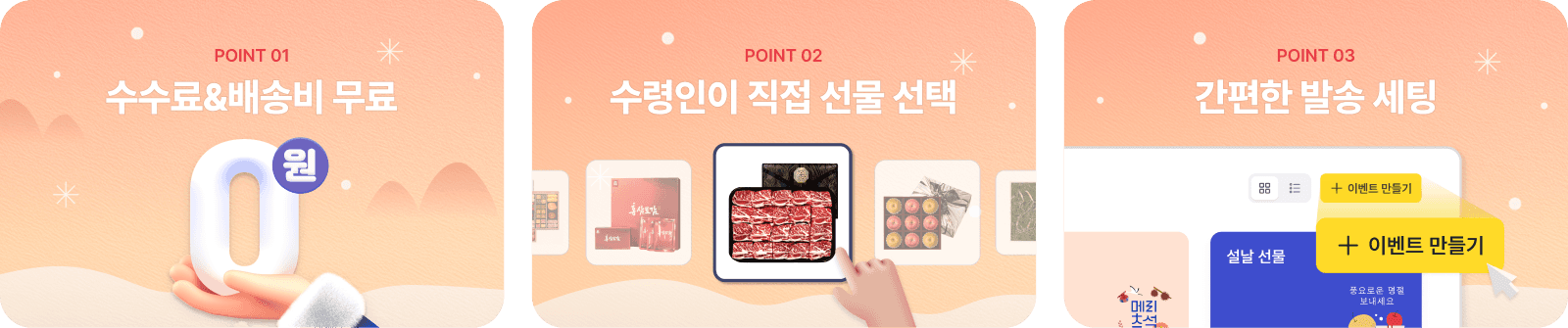 이번 설날에는 클릭 몇 번으로 선물 준비를 쉽고 빠르게 끝내보세요! 임직원의 연락처와 이름만 일괄 등록하면 지정 일자에 지정한 선물 목록이 직원들에게 전달되어요. 직원들은 직접 자신이 원하는 선물을 고르고, 받고 싶은 주소를 기재할 수 있죠.
