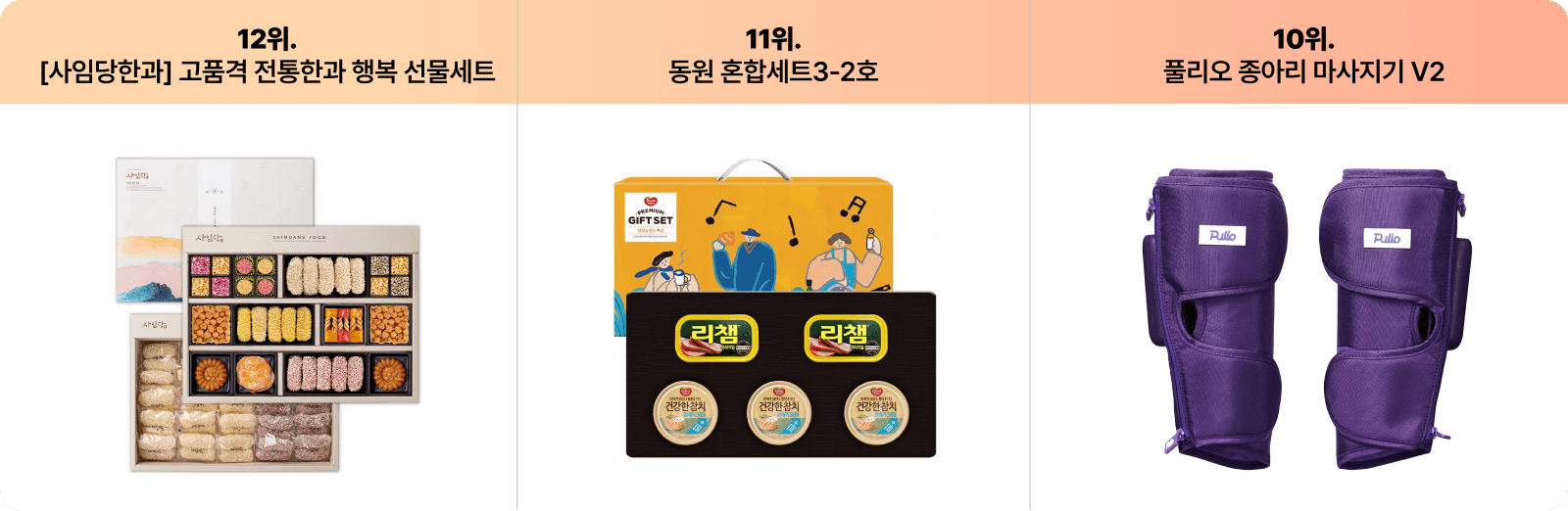 12위. [사임당한과] 고품격 전통한과 행복 선물세트, 11위. 동원 혼합세트3-2호, 10위. 풀리오 종아리 마사지기 V2