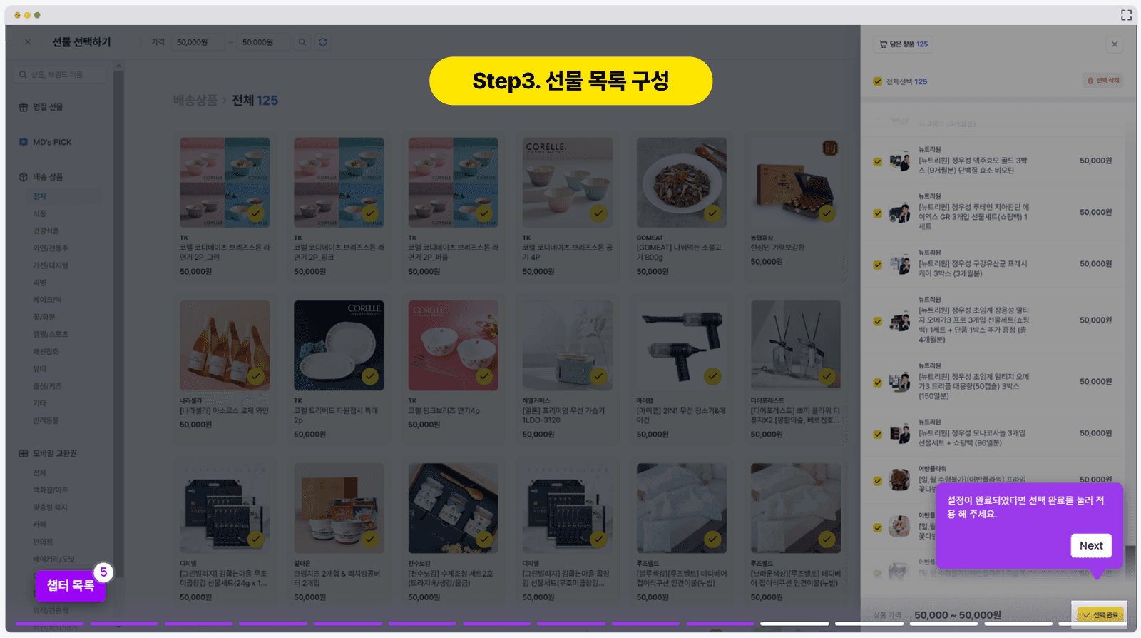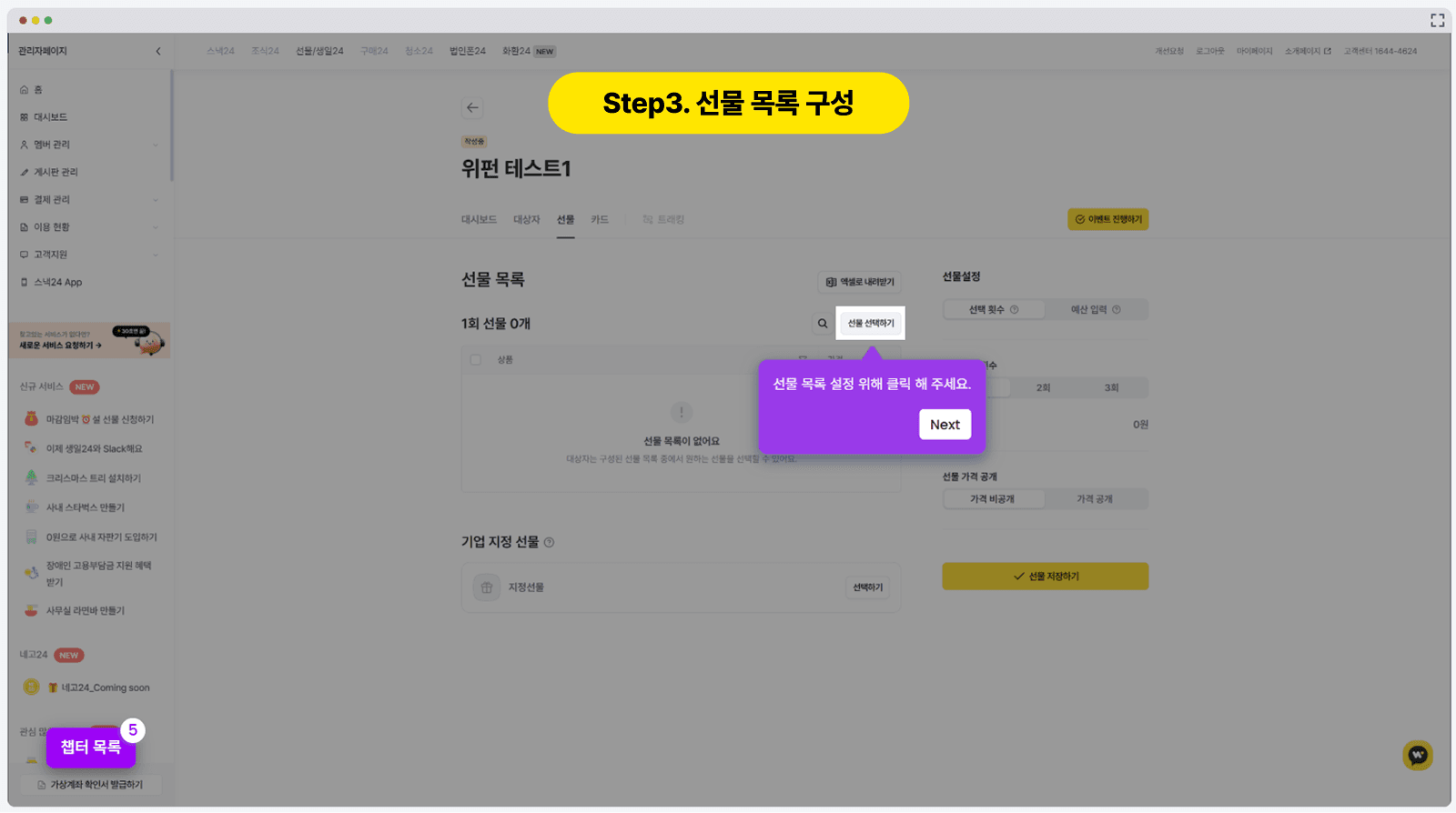 선물 목록 구성: 임직원이 직접 고를 수 있는 '선물 목록'을 구성하거나 특정 상품을 지정해요. 계획된 예산 안에 해당하는 품목이라면 자유롭게 설정할 수 있어요.