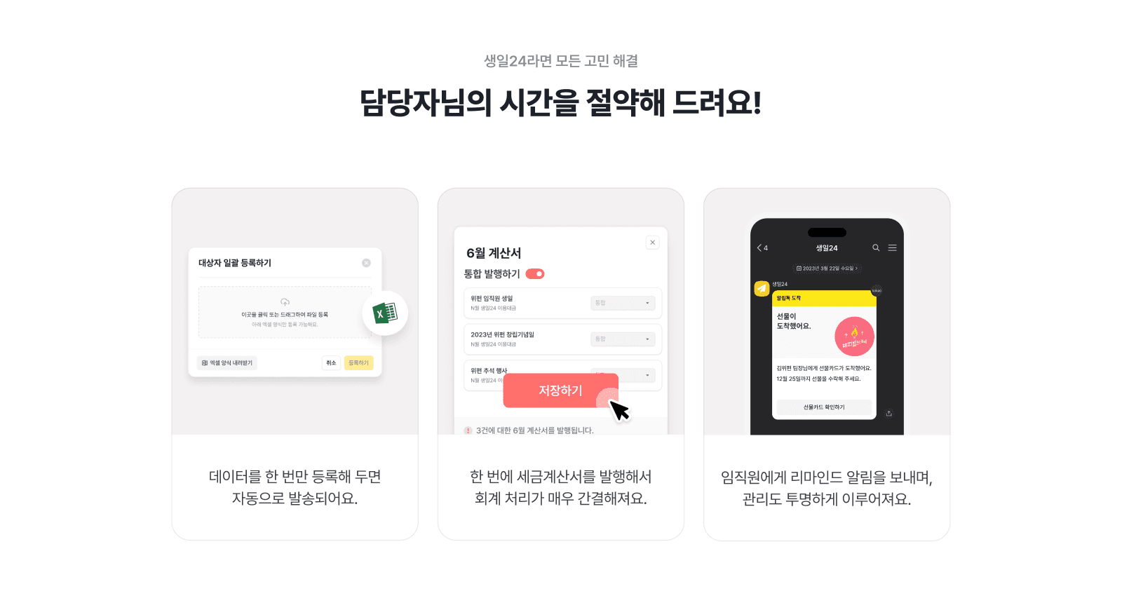 생일24는 이러한 번거로운 과정들을 스마트하게 자동화하여 담당자님들의 시간을 절약해 드려요.