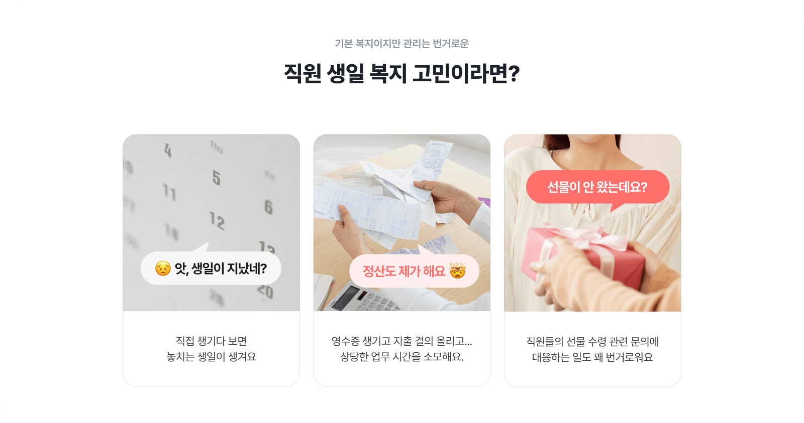 직원들의 취향을 만족시키는 다양한 선물을 준비하는 것은 좋지만, 실제로 이를 운영하는 담당자님들은 다음과 같은 현실적인 고충을 겪고는 해요.