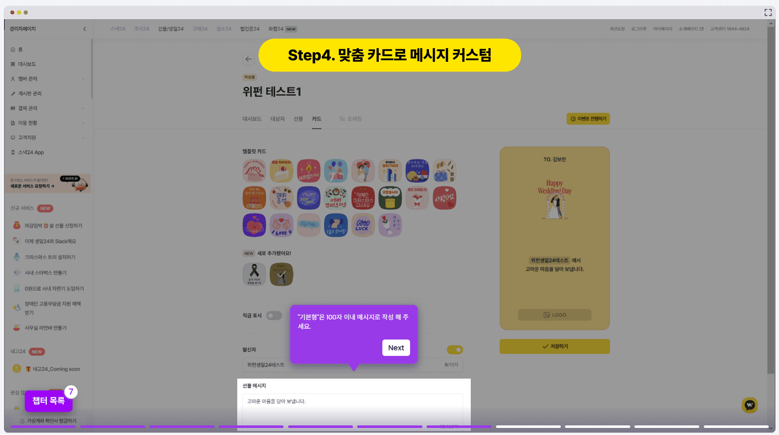 맞춤 카드로 메시지 커스텀: 기업 로고와 정성 어린 축하 문구가 담긴 메시지 카드를 함께 발송할 수 있어요.