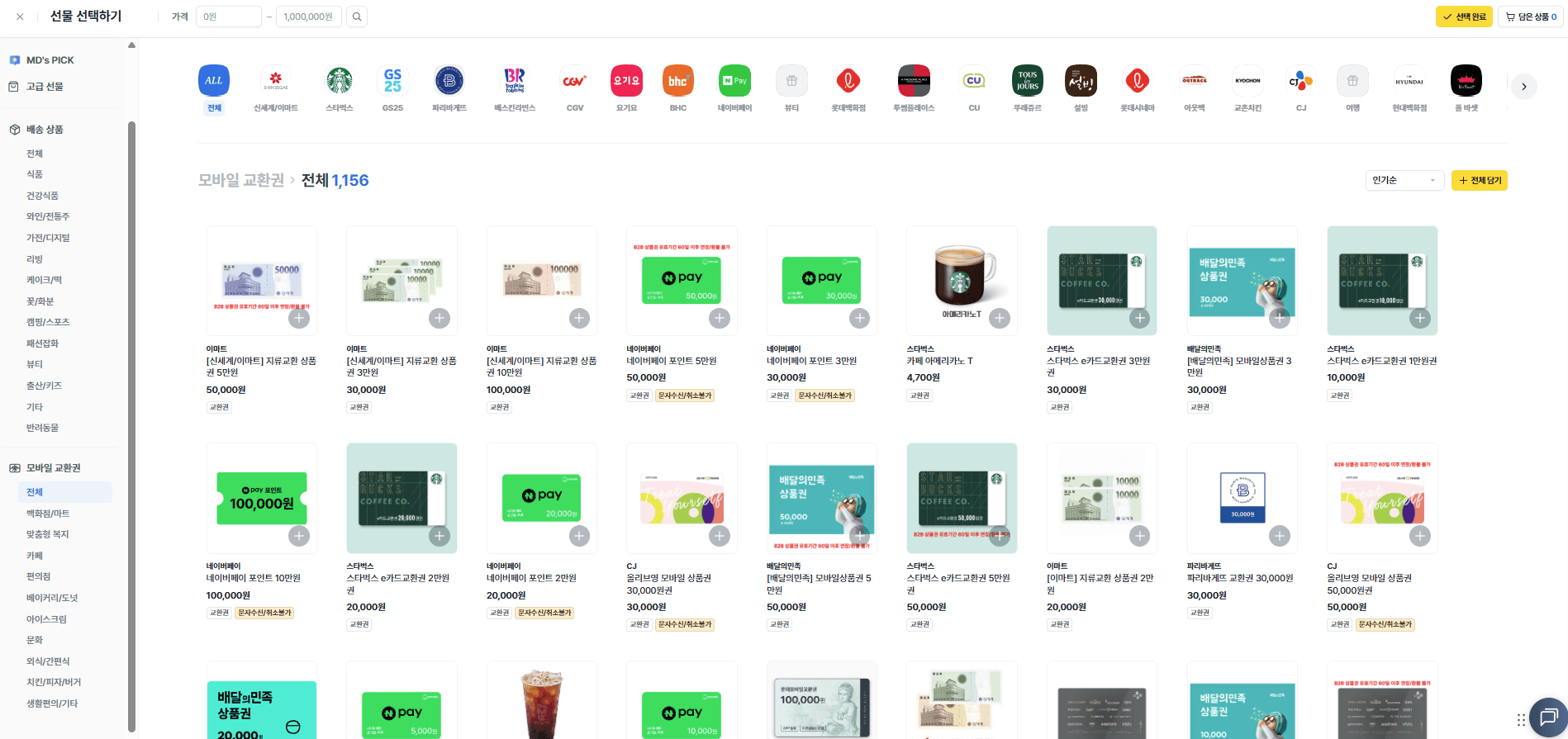 골라 받는 재미가 있는 상품권 라인업