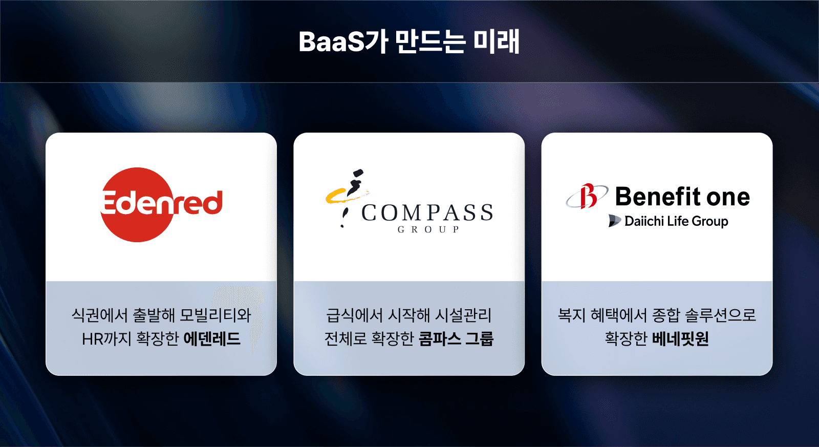 에덴레드는 식권에서 출발해 모빌리티와 HR까지, 콤파스는 급식에서 시작해 시설관리 전체로, 베네핏원은 복지 혜택에서 종합 솔루션으로 확장했어요.