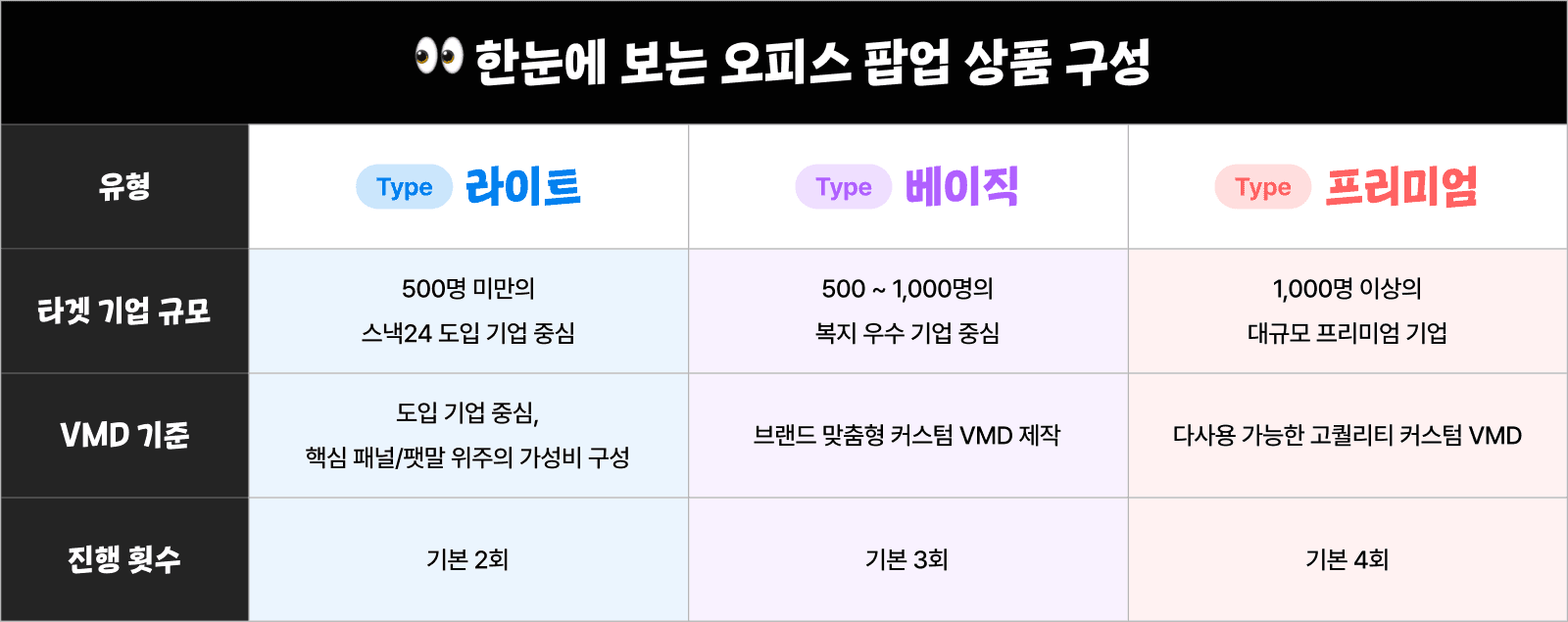 베이 | 500 ~ 1,000명의 복지 우수 기업 중심 | 브랜드 맞춤형 커스텀 VMD 제작 | 기본 3회 |