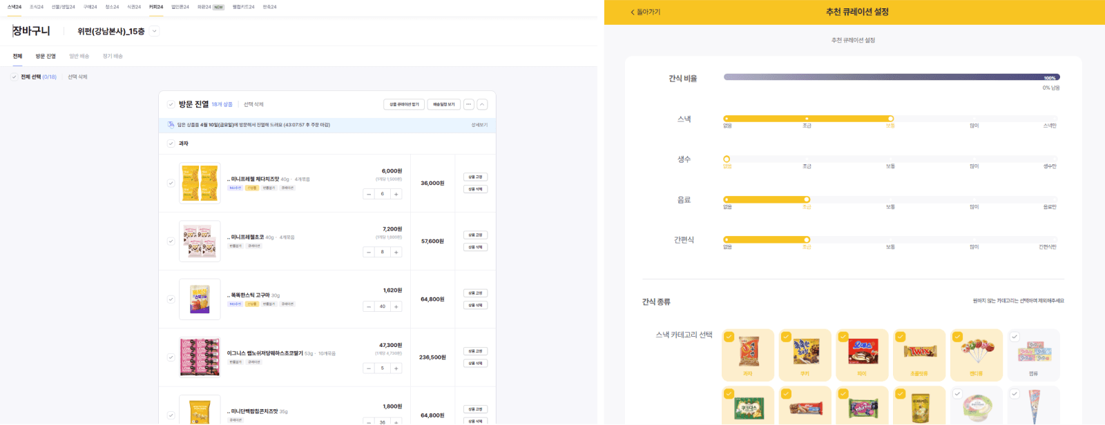 회사에서 직접 담는 것이 아니라 스낵24에서 보장하는 인기 상품들만을 받아보고 싶으시다면 ‘상품 큐레이션 받기’ 기능을 이용해 추천 상품을 받아볼 수도 있어요. ‘스낵, 생수, 음료, 간편식’ 각 카테고리의 비율과 세부 카테고리들을 직접 체크할 수 있죠.