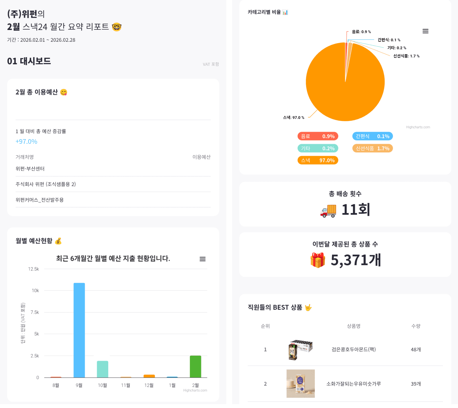 특히 카테고리별 이용 비율과 이달의 인기 상품 통계를 통해 우리 직원들이 어떤 간식을 가장 선호하는지 데이터로 정확히 파악할 수 있는데요. 이러한 데이터는 다음 달 간식을 준비할 때는 물론, 내부 보고용 자료로 활용하기에도 정말 유용해서 일잘러 담당자님들의 만족도가 매우 높답니다.