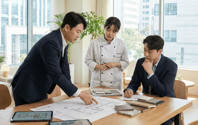 전문 업체와 함께 도면 작업부터 법적 기준에 맞는 시설 설계와 기물 세팅까지 전담해 지원합니다