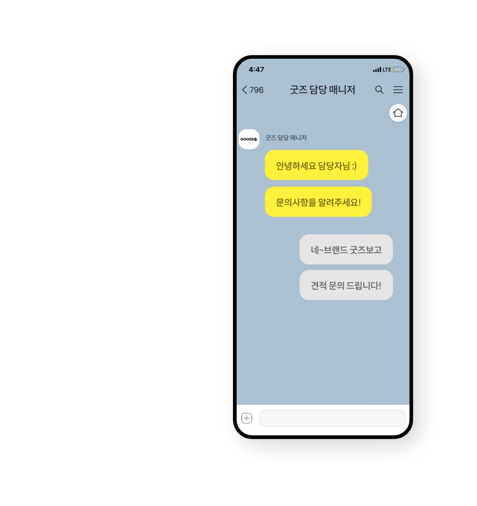굿즈 상품 종류 및 커스텀 내용 관련 1:1 상담을 진행합니다.