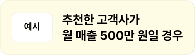 *정기서비스 혹은 1회성 서비스 모두 가능(단, 1회성 서비스는 단건으로 수수료 지급) / *서비스 종류에 따라 수수료율이 달라질 수 있음 / *12개월간 실매출의 ~5% 지급(계약 조건에 따라 상이할 수 있음) / *실매출 발생일로부터 익월 말일 지급 (정상입금 기준) / *만약 12개월이 되기 이전에 계약을 해지한다면 보상도 중단됨 / *유가 증권 및 vat는 실매출 제외 / *고객사 할인율에 따른 대행 수수료 변동가능 / *고객사 미납 발생 시 지급 지연